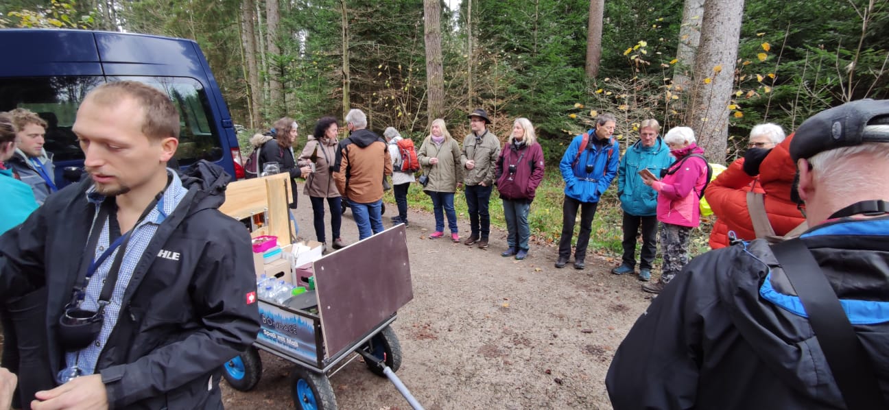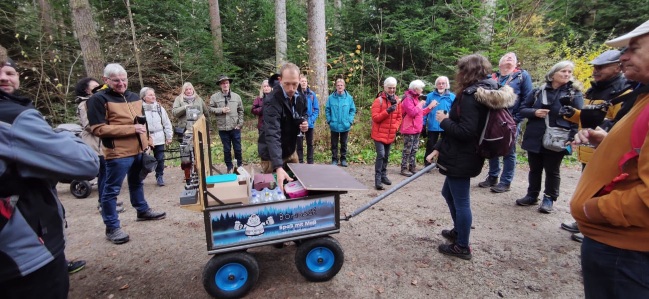 Immer tieferging es ins Tal hinein und wir kamen zum Märtesweiher, einem künstlich angelegten kleinen See, welcher den idealen Lebensraum für verschiedene Tier- und Pflanzenarten bietet. Vorbei ging es am Genussplatz am Simonsbrunnen und immer weiter bis zur Stoffelshütte, wo wir erneut eine kleine „Zwangs-Regen-Pause“ einlegten.